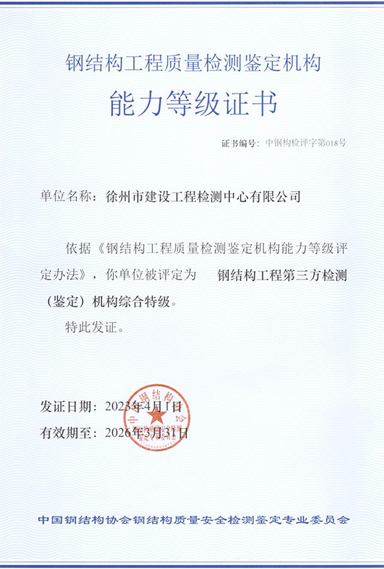 徐州市建設工程檢測中心有限公司(以下簡稱徐建檢測公司)是徐州市產城發展集團有限公司(以下簡稱產城集團)的全資子公司。徐建檢測公司前身為徐州市建設工程檢測中心,2018年事轉企改制,2020年4月,完成轉企改制資產劃轉工作。 徐建檢測公司是集檢測、檢驗、鑒定、咨詢等技術服務為一體、具有獨立法人資質的綜合性第三方服務機構。公司主要從事建設工程領域相關工程質量檢測及技術咨詢服務,業務覆蓋地基基礎、建筑材料、建筑結構、鋼結構工程、市政工程、綠色建筑節能工程、建筑安全與施工設備、建筑防水、建筑水電、裝飾裝修、建筑物防雷、室內環境、房屋安全鑒定、城市軌道交通工程等專業領域。......